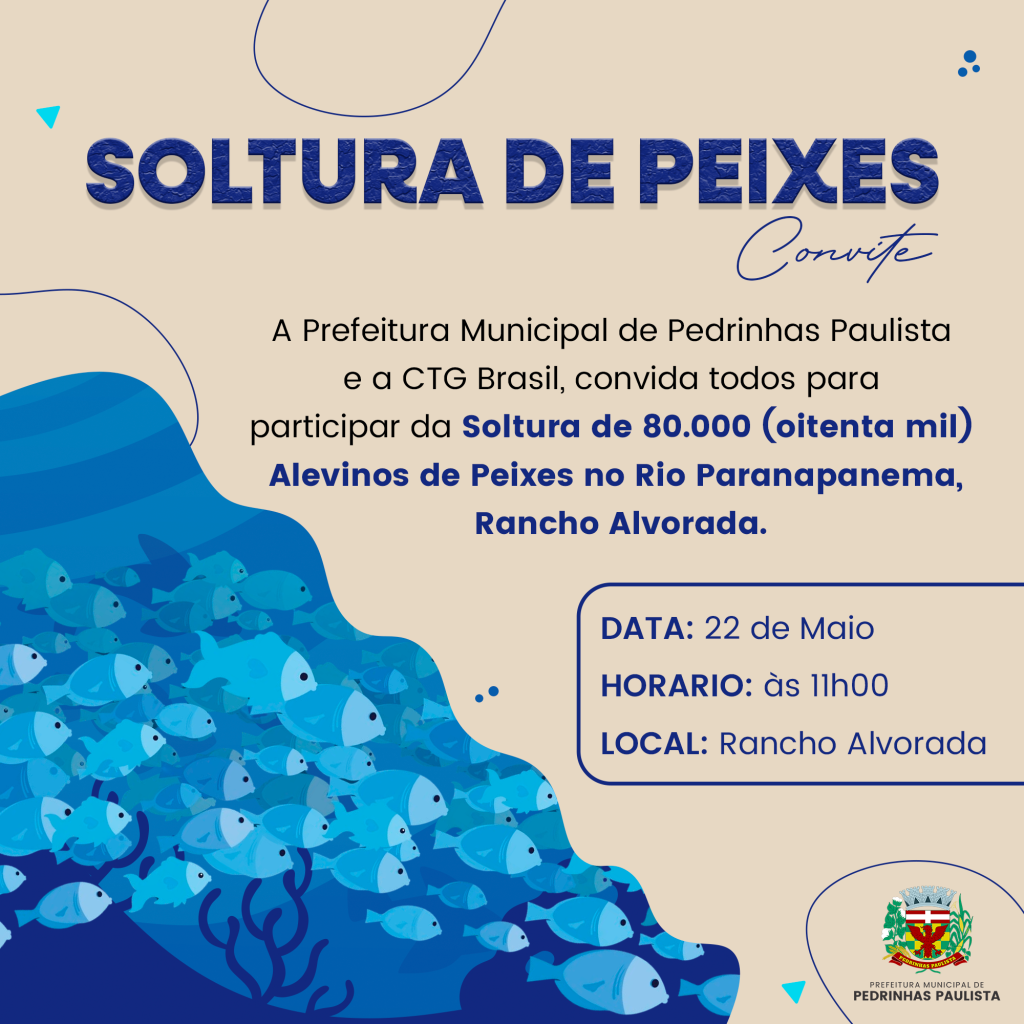 A Prefeitura de Pedrinhas Paulista convida toda a população para participar da soltura de alevinos, que será realizada nesta quinta-feira, dia 22 de maio, às 11h00, no Rancho Alvorada, às margens do Rio Paranapanema.