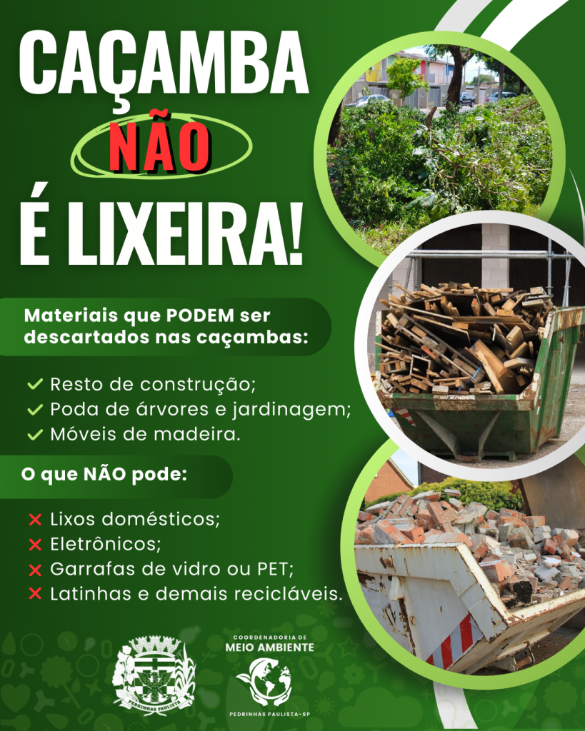 A Prefeitura Municipal, por meio da Coordenadoria de Meio Ambiente, orienta a população sobre a correta utilização das caçambas de entulho disponibilizadas no município.
