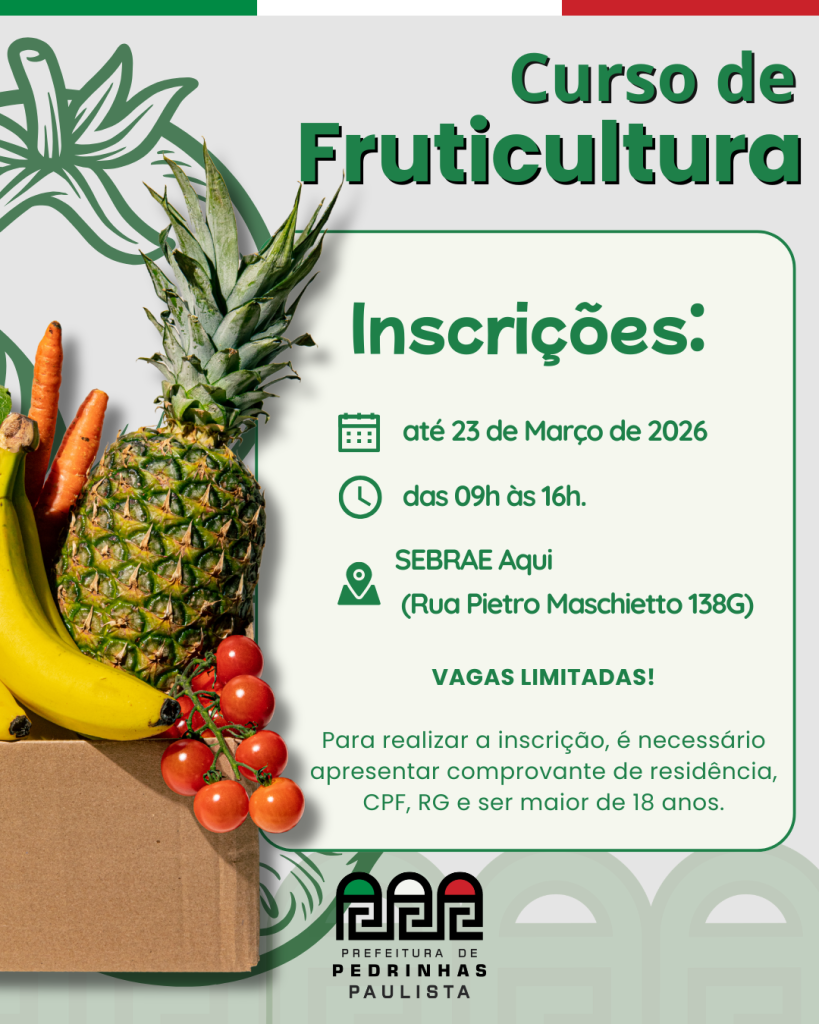 A Prefeitura Municipal de Pedrinhas Paulista, em parceria com o Sindicato Rural de Maracaí, o SEBRAE Aqui e o SENAR, informa que estão abertas as inscrições para o Curso Gratuito de Fruticultura, que será realizado nos dias 26 e 27 de março.