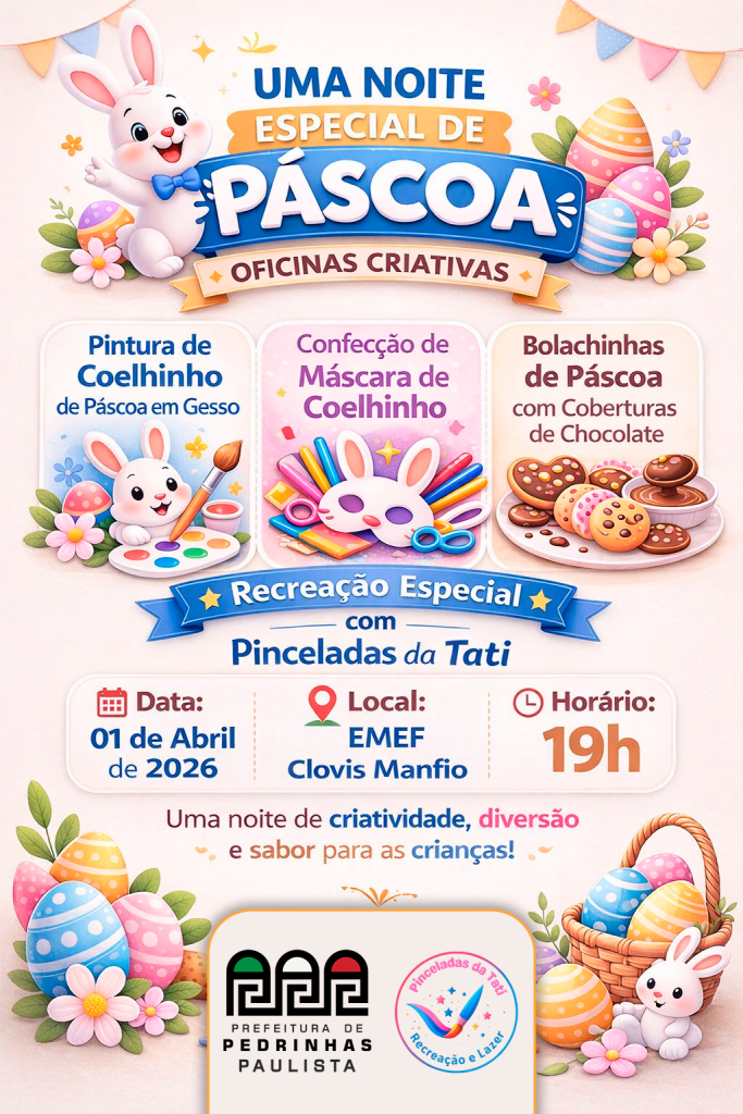 A Prefeitura de Pedrinhas Paulista convida toda a comunidade para a entrega de ovos de Páscoa aos alunos da rede municipal de ensino, que será realizada no dia 01 de abril, às 19h, na EMEF Clovis Manfio.