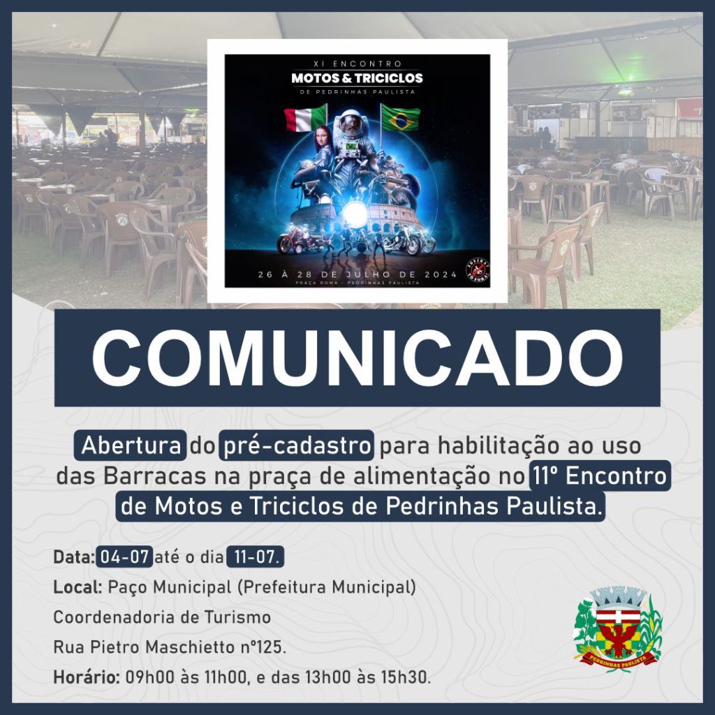 Os comerciantes e ambulantes residentes no Município, inseridos no segmento de alimentação interessados em participar do 11° Encontro de Motos e Triciclos de Pedrinhas Paulista deverão realizar o pré-cadastrado na Prefeitura Municipal.