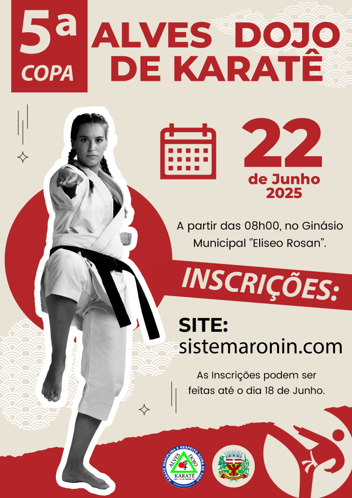 A Prefeitura Municipal, através da Secretaria de Turismo e Esportes em parceria com a Academia Alves Dojo de Karate, informa que já estão abertas as inscrições para a 5ª Copa Alves Dojo de Karate em Pedrinhas Paulista.