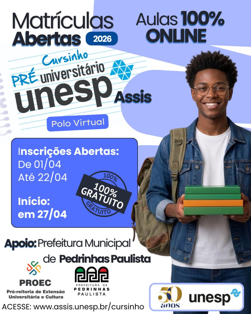 A Prefeitura Municipal de Pedrinhas Paulista, em parceria com a Universidade Estadual Paulista (UNESP), informa que estão abertas as inscrições para o Cursinho Pré-Universitário.